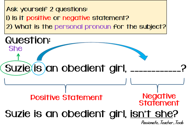 1) Notes on the different types of question tags (both positive and negative) for both present and past tenses.